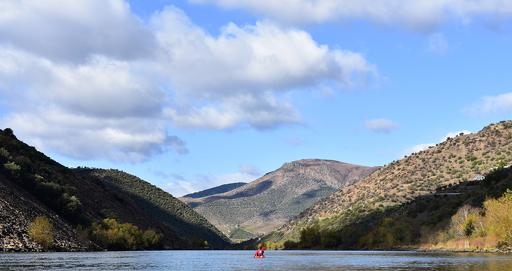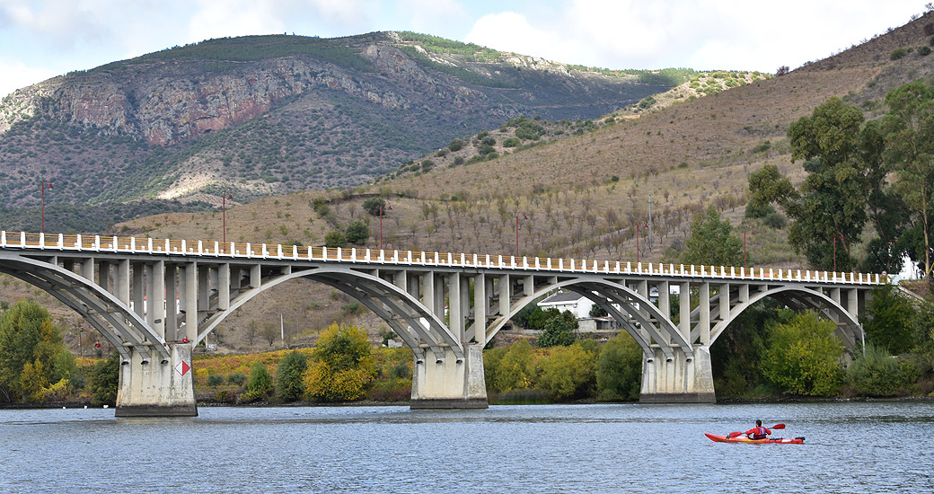 Estamos en el canal de navegación del Douro Portugués y hasta aquí, llegan los grandes cruceros que recorren esta bonita travesía. Revisa el apartado de "Navegación en el canal del Douro" de esta guía para obtener información y recomendaciones relativas a la navegación en este tramo. Ahora el río discurre en un cauce muy abierto y ancho donde las laderas empiezan a llenarse de viñedos. Comenzamos a ver los primeros carteles que anuncian la llegada a alguna de las Quintas, bodegas de vino, que se ubican a orillas del Duero, dentro de esta famosa e histórica región vinatera. En el km 18 encontraremos en orilla izquierda una playa de arena donde tomarnos un descanso de esta larga jornada. El río toma dirección noroeste y así continuara hasta la confluencia con el río Coa, afluente principal por el lado izquierdo, donde encontramos un viaducto de la linea de Ferrocarril y el primer punto accesible con coche desde Barca de Alba.