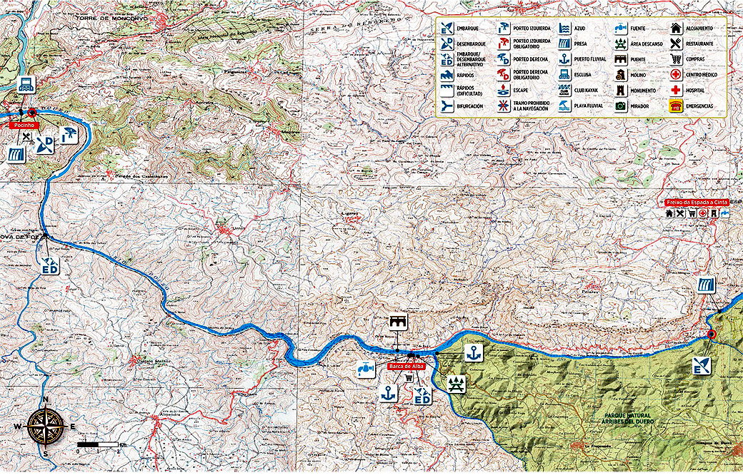 Presa de Pocinho. Pese a que la presa de Pocinho dispone de una esclusa que habilita su navegación, encontraremos un porteo alternativo por el lado izquierdo. Deberemos desembarcar en el puerto del lado izquierdo y continuar por el camino que accede hasta el puerto desde Pocinho. Al cruzar la vía de tren, en desuso, la continuaremos hasta rodear las instalaciones de la planta hidroeléctrica y buscaremos entonces un sendero que nos conduce de nuevo al río. Se trata de un pequeño camino en el que deberemos andar con cuidado entre bloques de piedra. El embarque debe hacerse tras superar un muro de hormigón que encauza el agua a la salida de turbinaje.